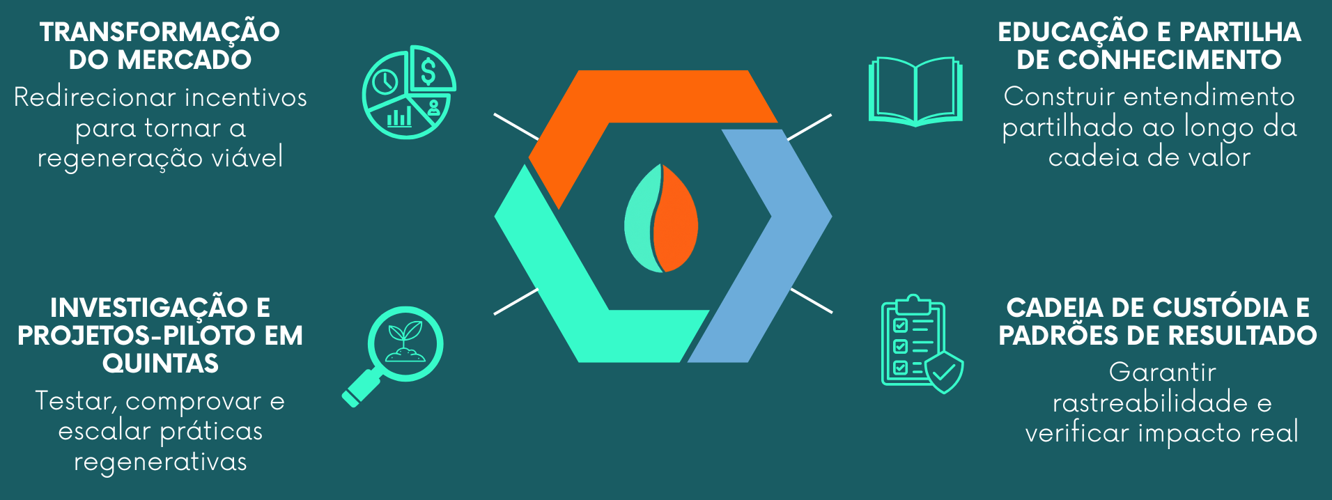 O trabalho colaborativo da nossa coligação está ancorado em quatro áreas principais que lançam as bases para transformar o sistema de fornecimento de amêndoas num modelo resiliente, regenerativo e preparado para o futuro.